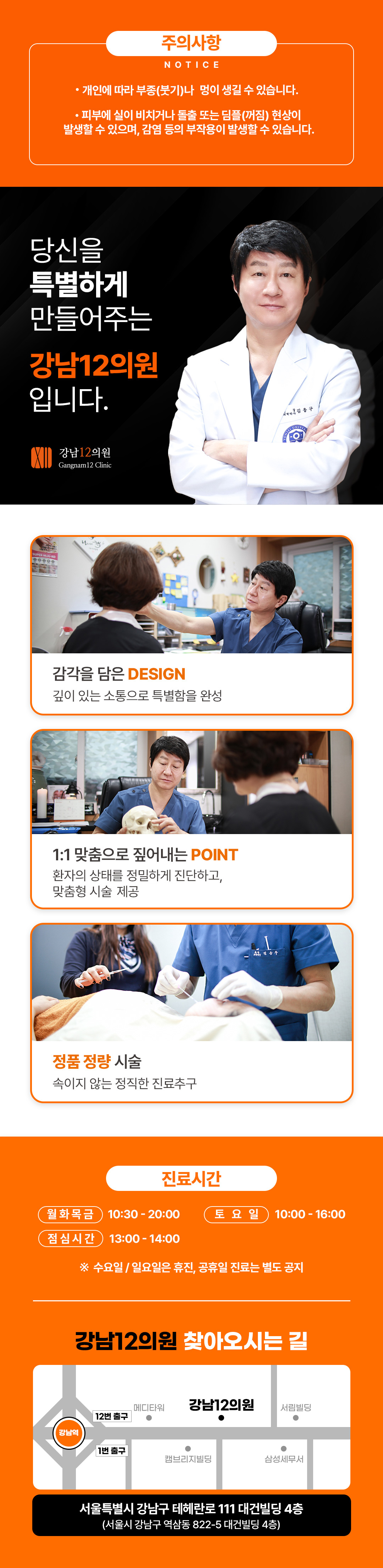 강남12의원은 강남역 12번 출구에 위치한 실리프팅&쁘띠성형 전담 병원입니다.
