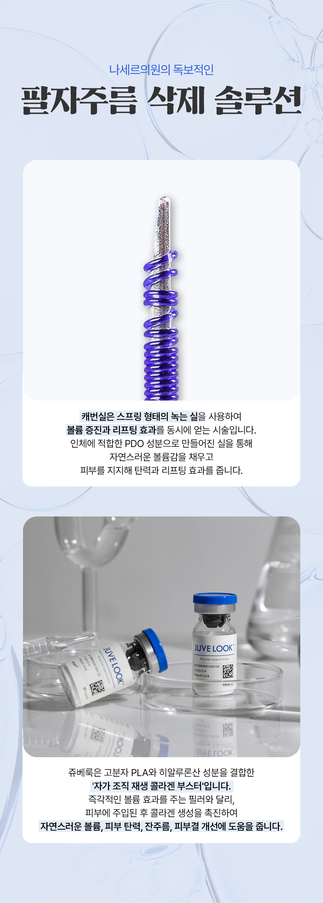 쥬베룩 스킨 4cc와 캐번실 4줄을 결합한 팔자주름 패키지는 탄력 저하와 볼륨 부족을 동시에 해결하는 프리미엄 시술입니다. 자가 콜라겐 재생을 돕는 쥬베룩이 피부 속부터 탄탄하게 차오르게 만들고, 스프링 형태의 캐번실이 깊은 주름 아래에서 강력한 지지대 역할을 하여 즉각적인 볼륨감을 만들어주는 원리입니다. 필러의 이물감이 걱정되셨던 분들도 안심하고 받으실 수 있으며, 표정 근육의 움직임에 따라 유연하게 반응하여 시술 후에도 인위적이지 않고 자연스러운 얼굴 라인을 완성할 수 있습니다.