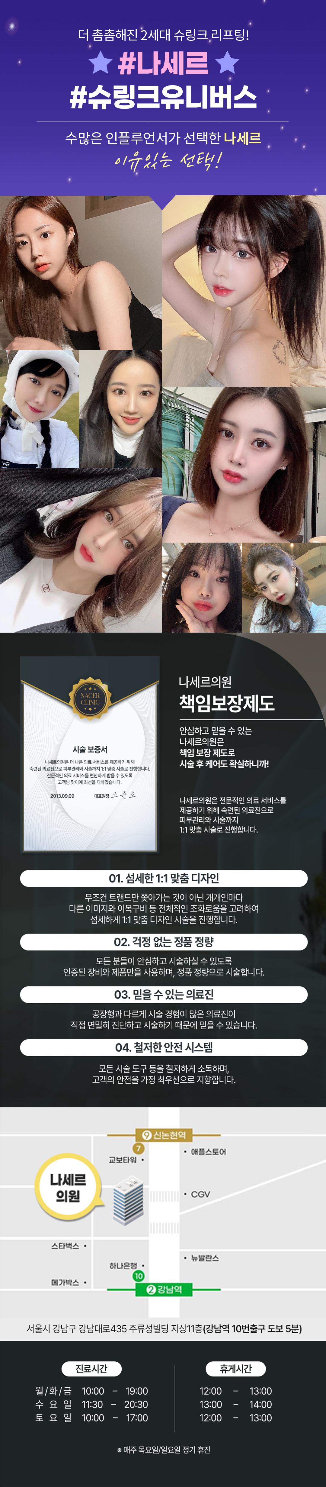오직 당신만을 위한 디테일로 이루어져있는 곳 나세르의원입니다. 다양한 쁘띠성형 혜택 받으세요!