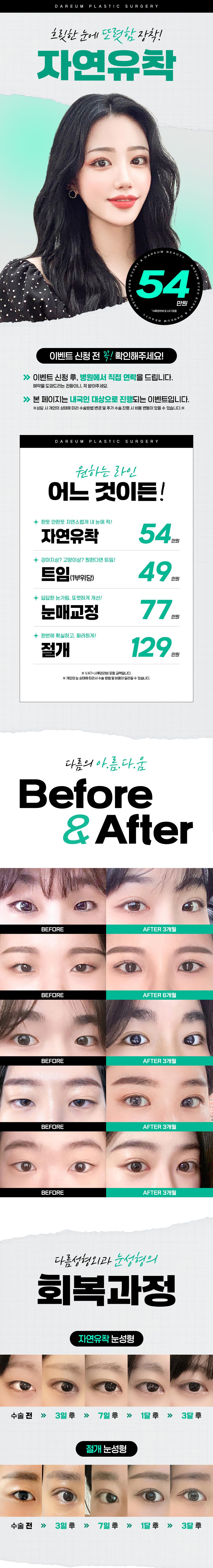 자연스러운 자연유착 쌍꺼풀, 선명한 쌍꺼풀, 트임성형, 눈매교정, 매몰로 예쁘게 마취비포함