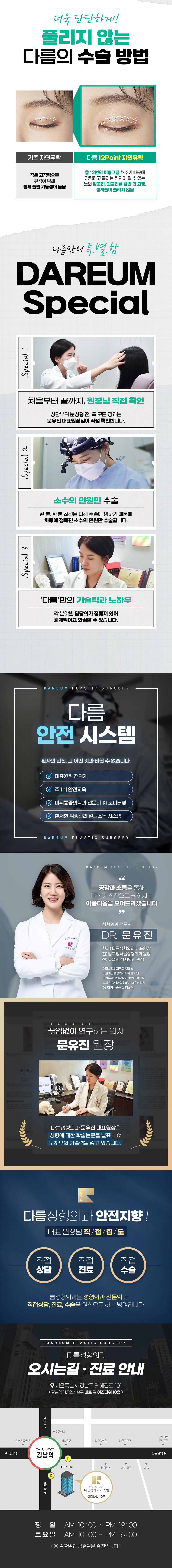 다 똑같은 성형이 아닌, 나만의 아름다움을 찾아서, 1%가 다른 성형을 위해 다름성형외과에서 노력하겠습니다. 다름성형외과는 성형경력 15년 이상의 송진우원장님의 코수술·코재수술, 문유진원장님의 눈수술·눈재수술을 위주로 아름다움을 찾아드리려고 노력하고 있습니다.
