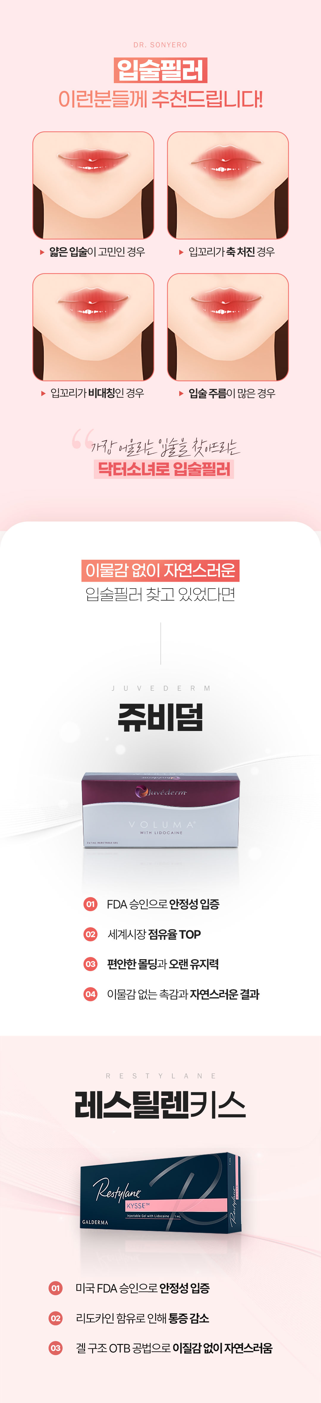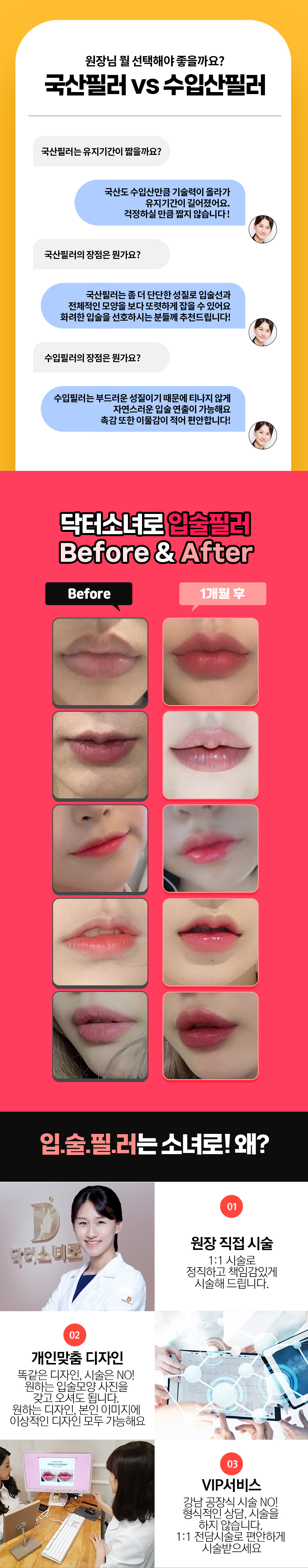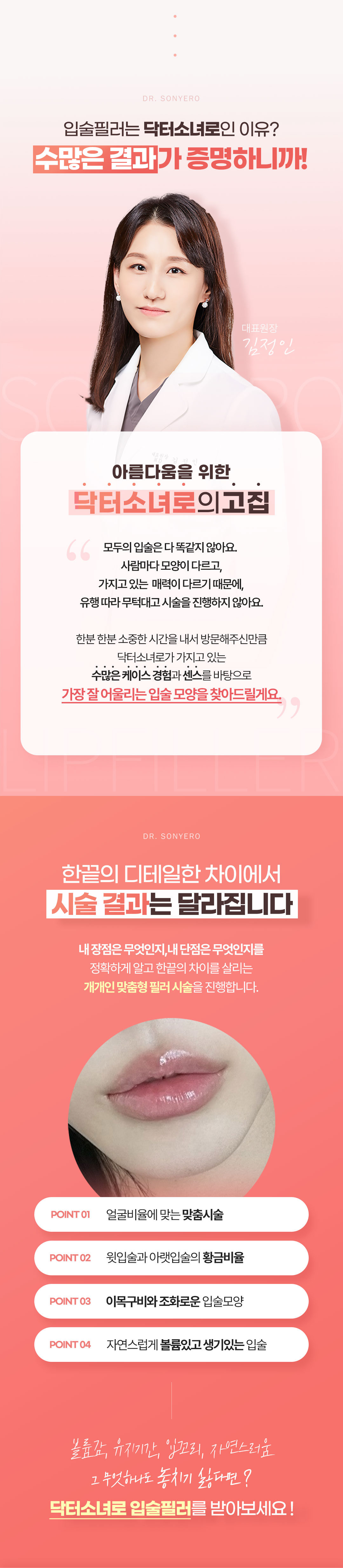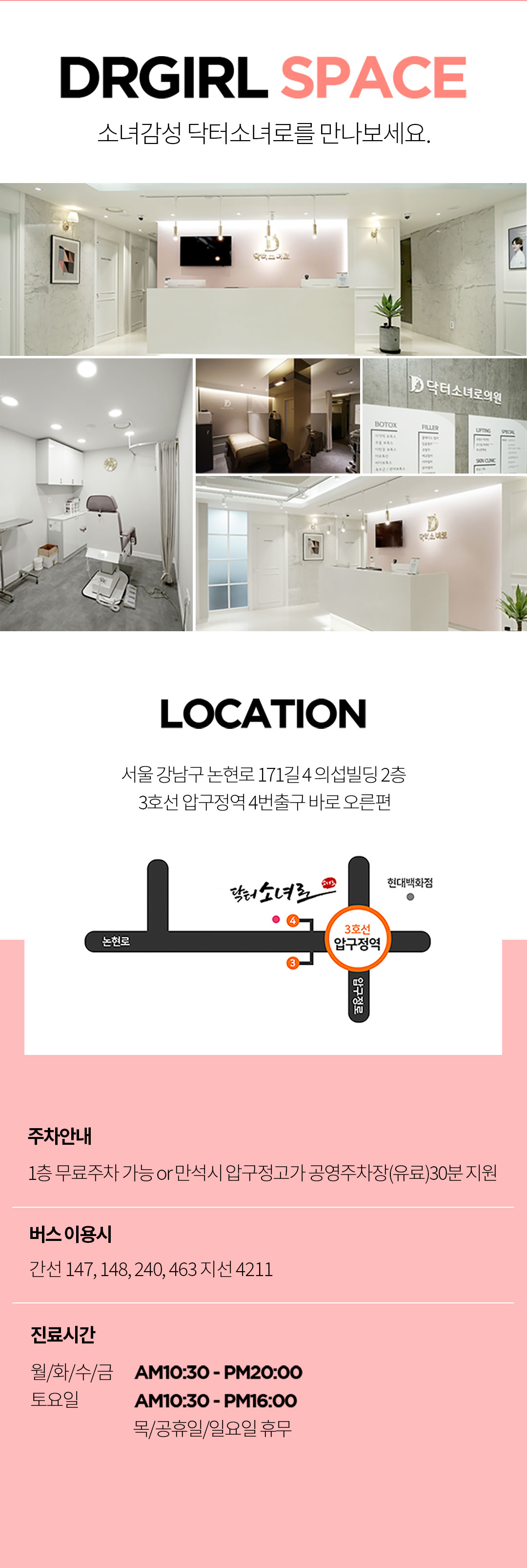 1. 대표원장 책임진료 2. 꼼꼼한 1:1 맞춤 상담 3. 압도적인 케이스의 시그니처 시술 4. 정직한 1회용 캐뉼라와 니들 사용 5. 특수니들로 통증 최소화 당신을 더 소녀롭게