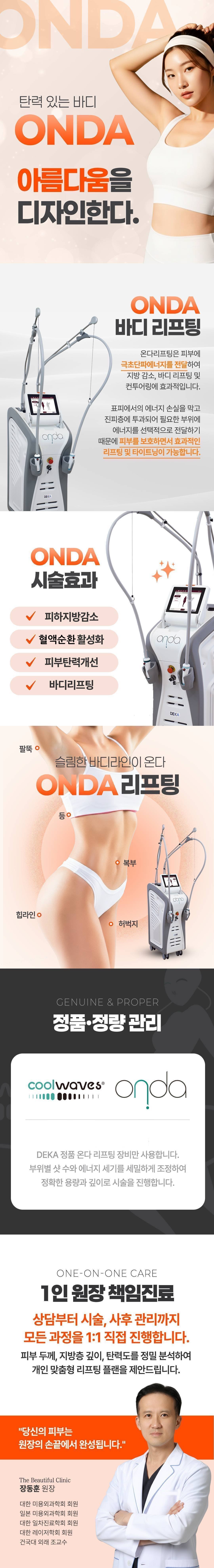 시술 원리 (Principle) ONDA는 듀얼 마이크로파(WaveWave 2.45GHz)를 이용해 지방층을 선택적으로 가열하여 피부 손상 없이 지방세포를 안전하게 파괴하고 피부 타이트닝을 동시에 유도합니다. 효과 (Effects) 국소 부위 지방 감소 바디 라인 개선 탄력 회복 및 피부 타이트닝 셀룰라이트 감소 개선 시술 직후부터 부기 적고 일상생활 바로 가능 특징 (Features) 지방 ONLY 타깃(피부·근육 손상 최소화) 통증·멍 거의 없음 시술 시간 짧고 회복 빠름 FDA·CE 인증 장비 동일 부위 반복 시술 가능, 리스크 낮음 다양한 바디·얼굴 라인에 적용 가능 정품·정량 안내 (Authenticity) The Beautiful Clinic은 정품 ONDA 핸드피스와 정식 승인된 팁·프로브만 사용하며, 1인 원장 책임 시술로 시술 강도·에너지·타깃 층을 정확히 맞춰 안전하고 일관된 결과를 제공합니다.