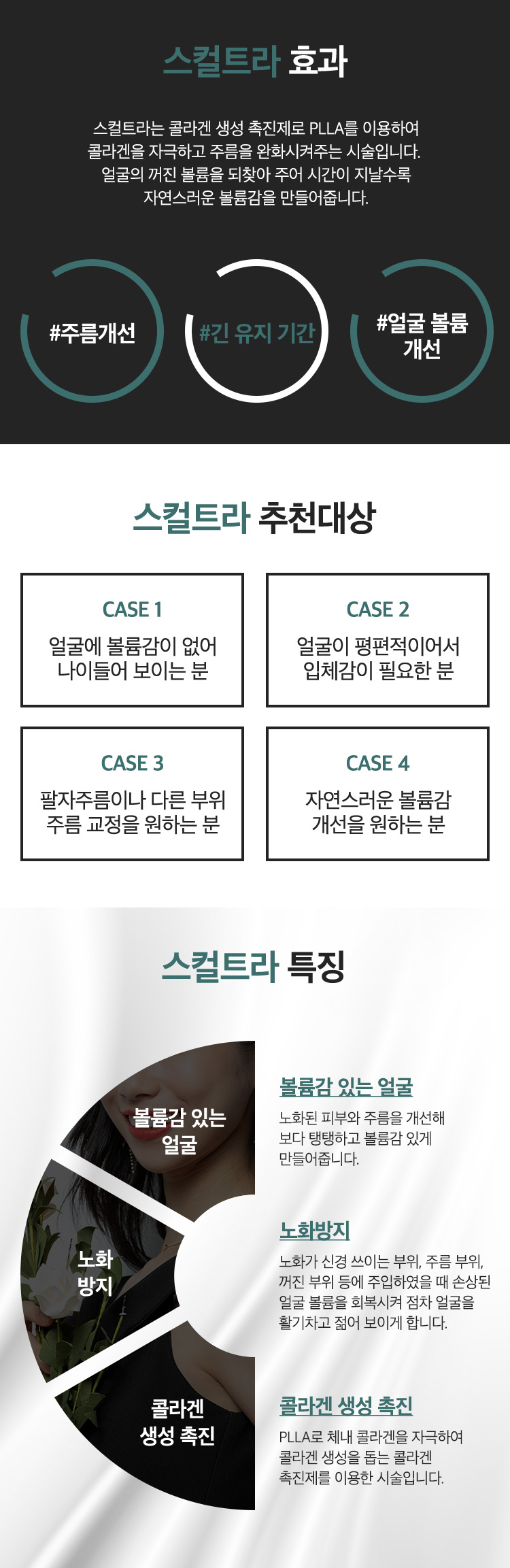 얼굴전체 부위 중 꺼짐, 그늘짐이 있는 부위에 자가 콜라겐을 생성하여 얼굴 전반적인 볼륨, 탄력, 안색, 라인 등을 개선하는 시술입니다. 시간이 지날수록 자연스럽게 볼륨이 차오르며, 평균 1년 반 정도 효과가 지속됩니다.