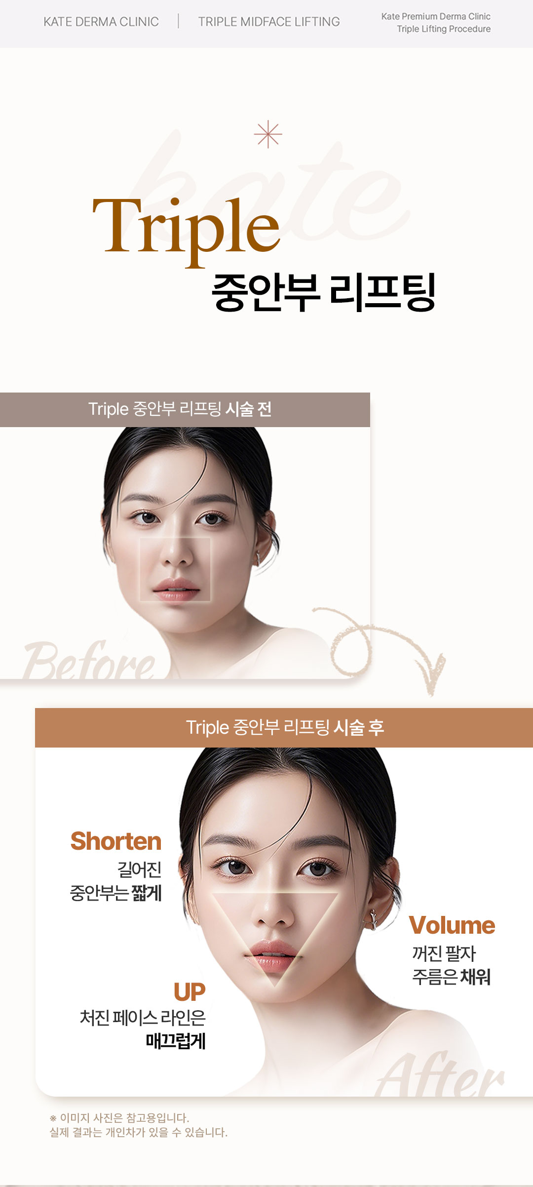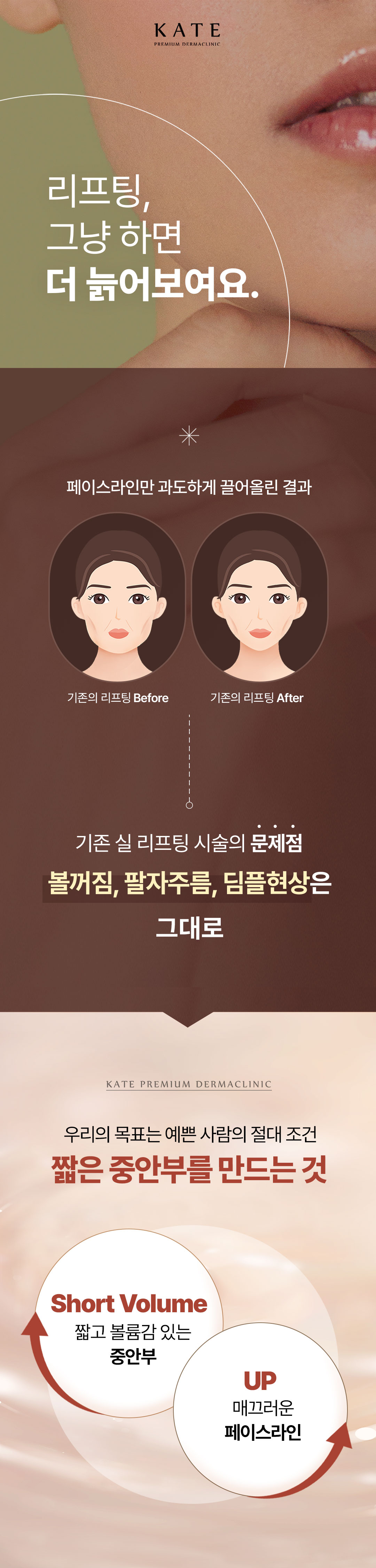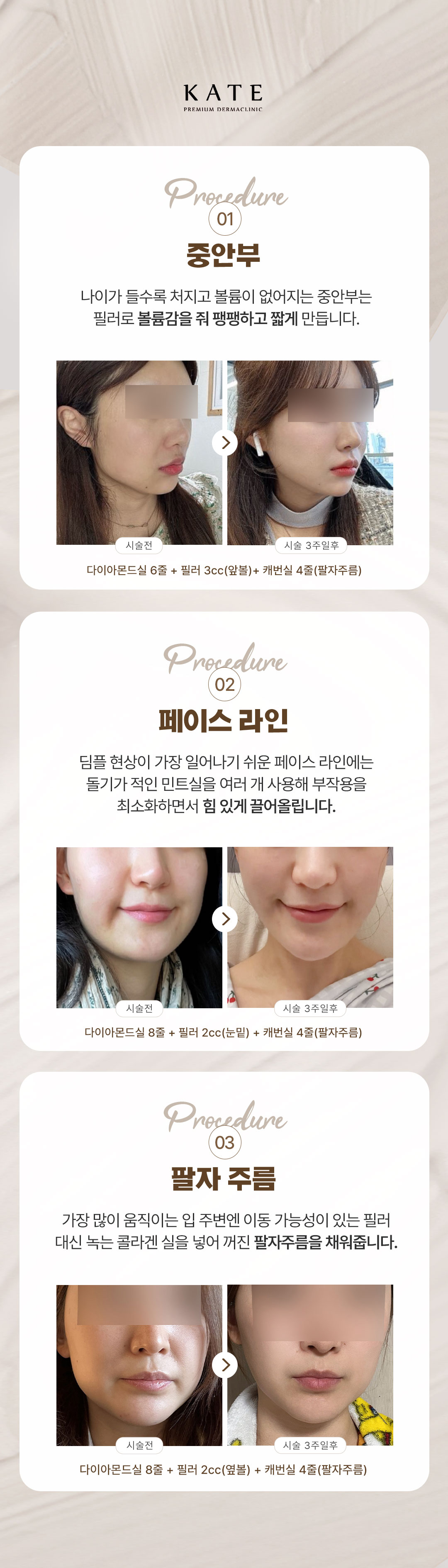 1. 중안부 단축은 실리프팅으로 페이스라인을 정리하고 2. 필러로 앞광대에 볼륨을 줘서 입체적인 얼굴을 만들어야 가능해집니다. 3. 팔자주름이 심하신 분들은 케번실(볼륨실)을 이용해서 팔자 주름 개선까지 함께 하는 것이 가장 효율적입니다.