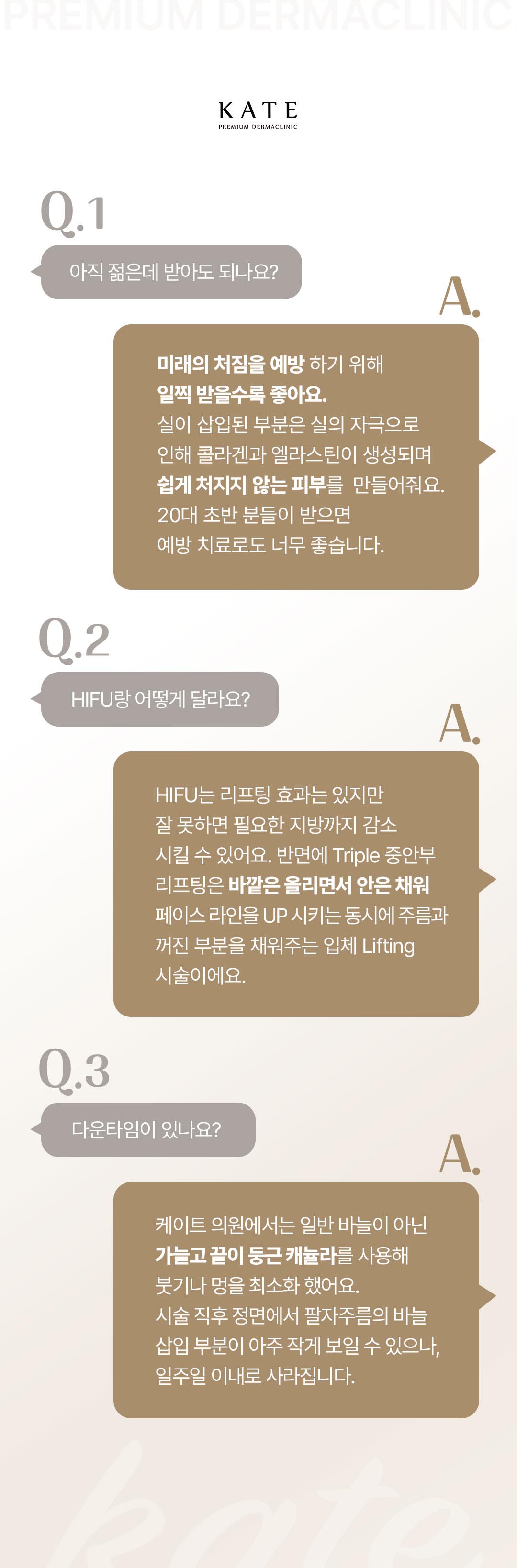 1. 갑자기 눈에 띄는 팔자주름과 쳐진 턱선엔? 튠페이스+티타늄 리프팅_튠타늄 2. 쉽사리 회복되지 않는 탄력 없는 피부엔? 튠페이스+울쎄라피프라임 리프팅_튠쎄라 3. 통증이 너무너무 싫은데 리프팅이 필요할땐? 티타늄리프팅_단독 시술