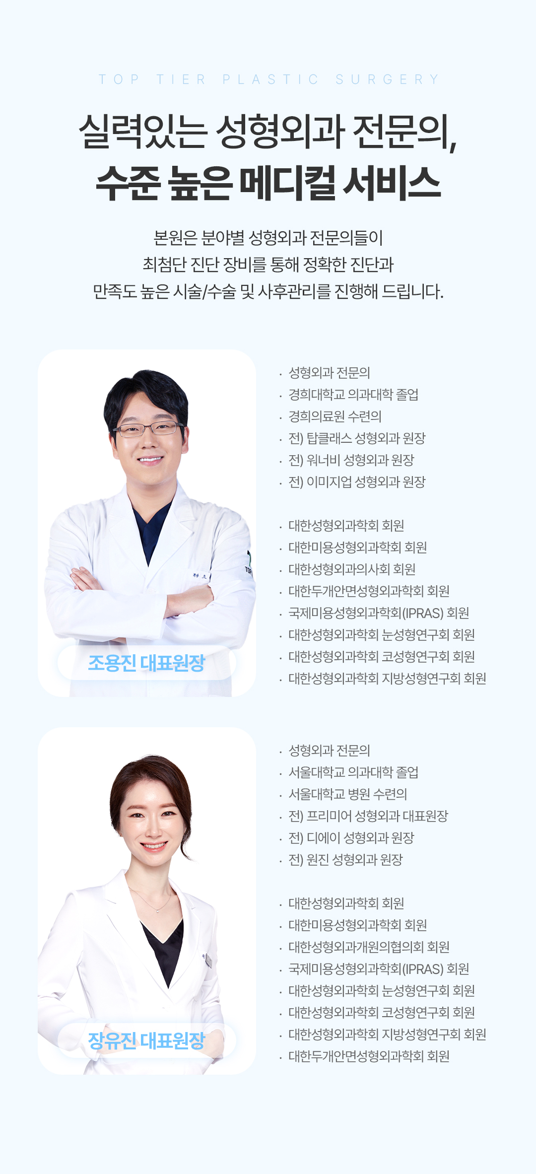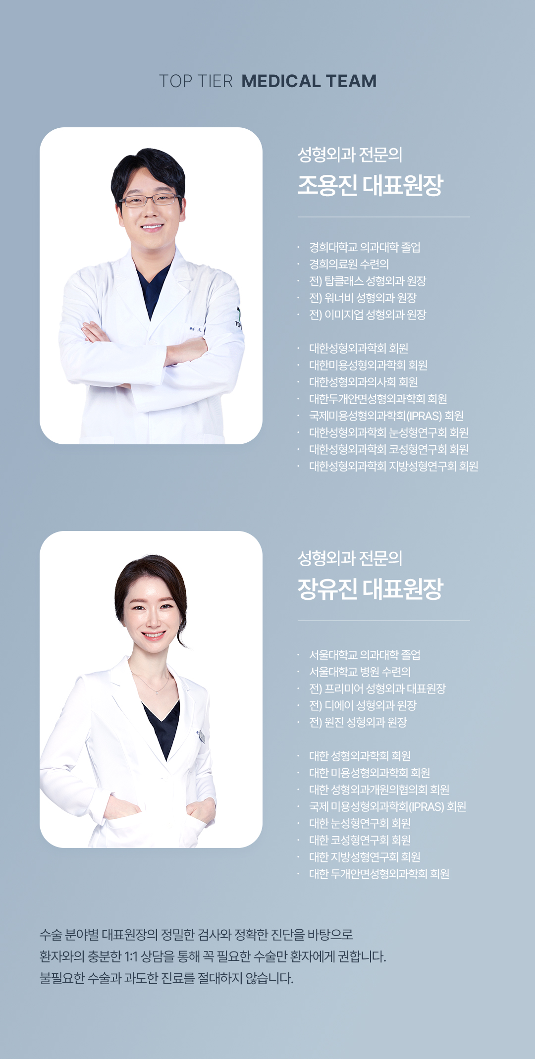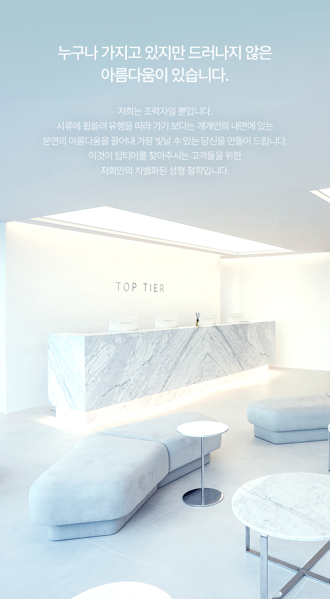 탑티어로 ㅡ 예쁜 나 탑티어로 ㅡ 멋진 나 TOP TIER Plastic Surgery 눈성형, 눈재수술, 코성형, 코재수술을 중심으로 남자성형, 안티에이징도 잘하는 탑티어성형외과 입니다. 남다른 미적감각으로 아름다움의 기준을 높이는 성형외과 전문의 조용진 대표 원장과 독보적인 라인으로 개인의 얼굴에 가장 자연스러움을 추구하는 장유진 대표 원장이 직접 상담과 수술 집도, 다년간의 경험으로 쌓은 노하우로 첫수술 뿐만 아니라 이전 수술결과에 대한 불만족 또는 부작용 케이스를 교정하는 재수술을 전담하고 있습니다.