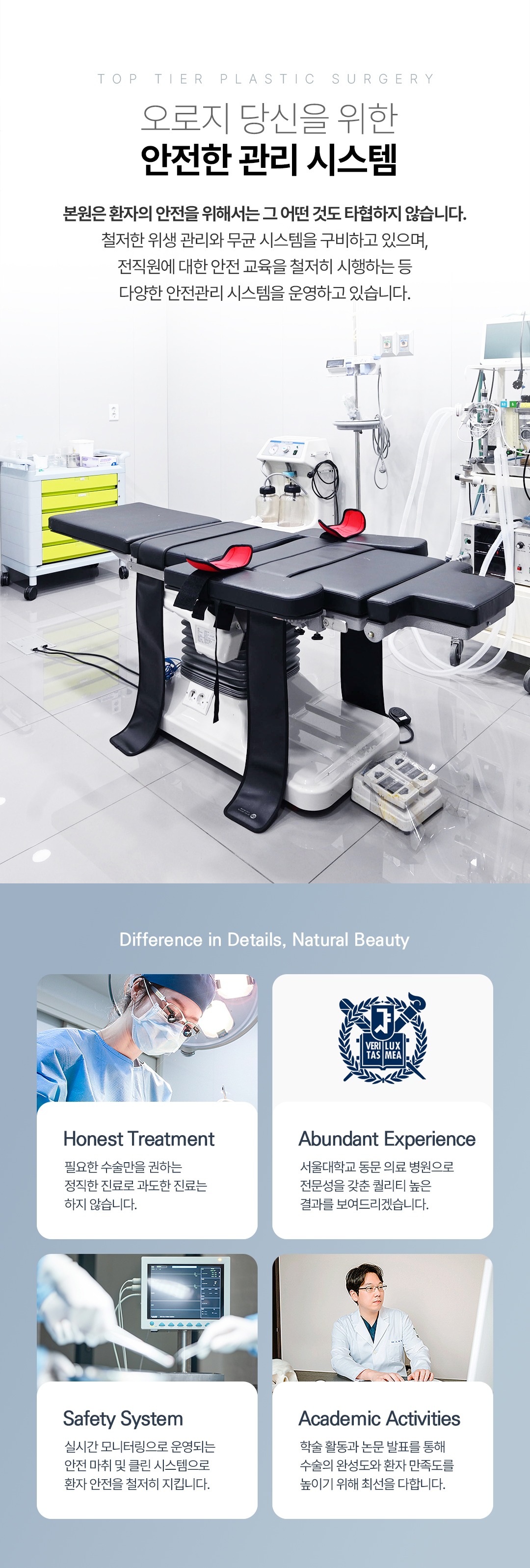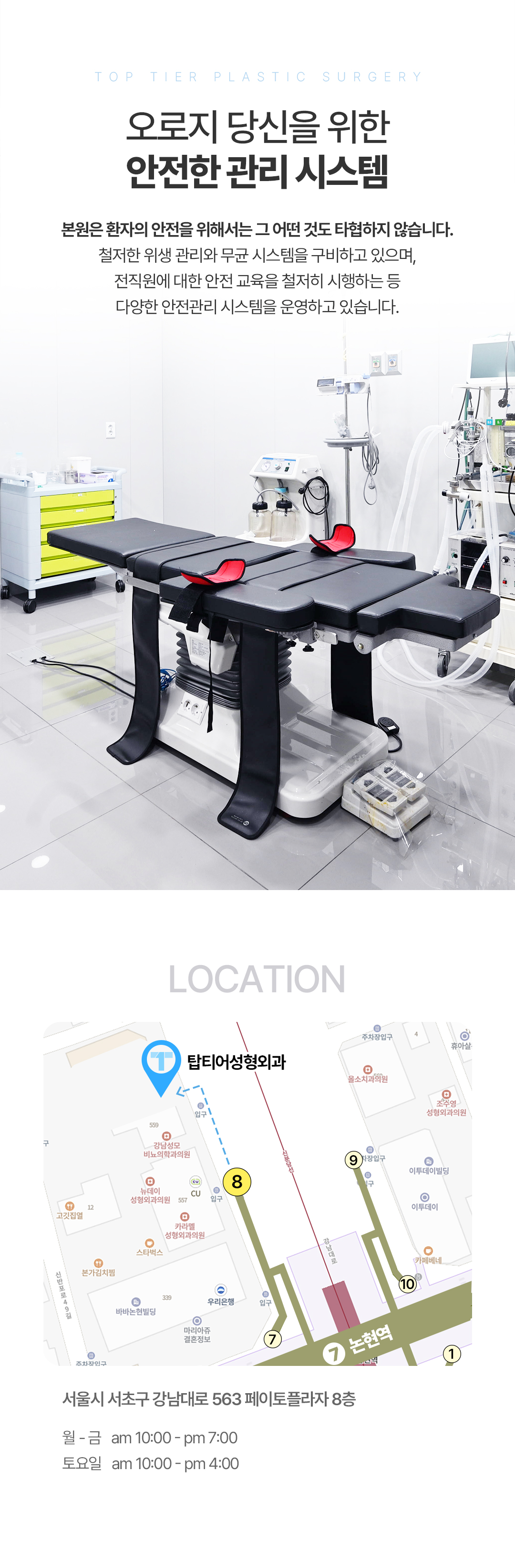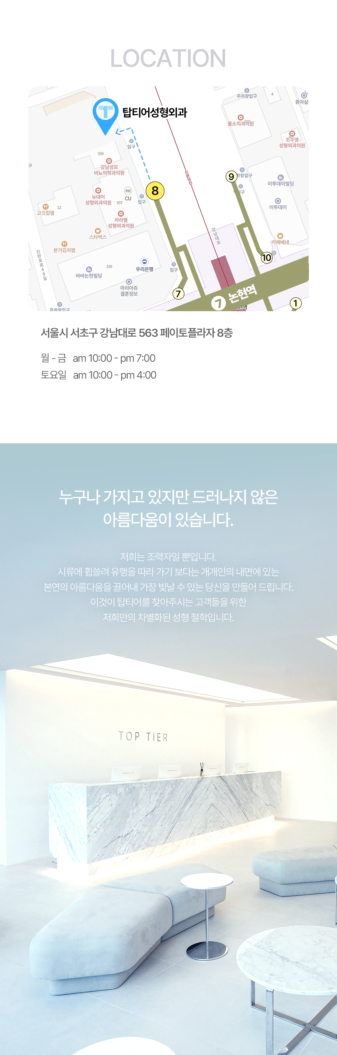 탑티어로 ㅡ 예쁜 나 탑티어로 ㅡ 멋진 나 TOP TIER Plastic Surgery 눈성형, 눈재수술, 코성형, 코재수술을 중심으로 남자성형, 안티에이징도 잘하는 탑티어성형외과 입니다. 남다른 미적감각으로 아름다움의 기준을 높이는 성형외과 전문의 조용진 대표 원장과 독보적인 라인으로 개인의 얼굴에 가장 자연스러움을 추구하는 장유진 대표 원장이 직접 상담과 수술 집도, 다년간의 경험으로 쌓은 노하우로 첫수술 뿐만 아니라 이전 수술결과에 대한 불만족 또는 부작용 케이스를 교정하는 재수술을 전담하고 있습니다.