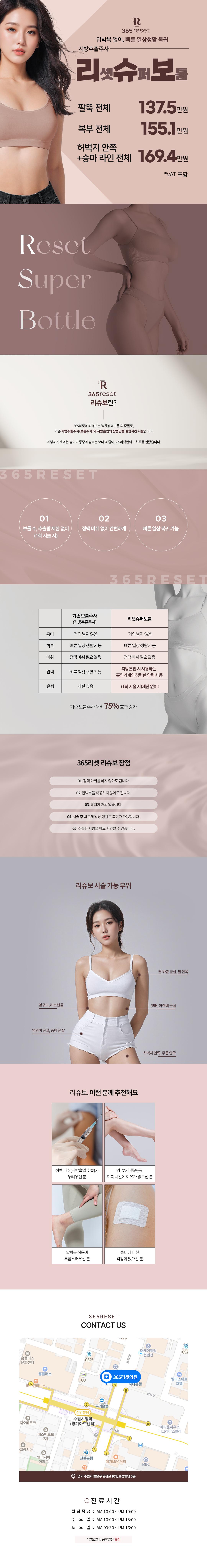 365리셋의 리슈보는 '리셋슈퍼보틀'의 준말로, 기존 지방추출주사(보틀주사)와 지방흡입의 장점만을 결합시킨 시술입니다. 지방제거 효과는 높이고 통증과 흉터는 보다 더 줄인 365리셋만의 지방추출주사입니다.